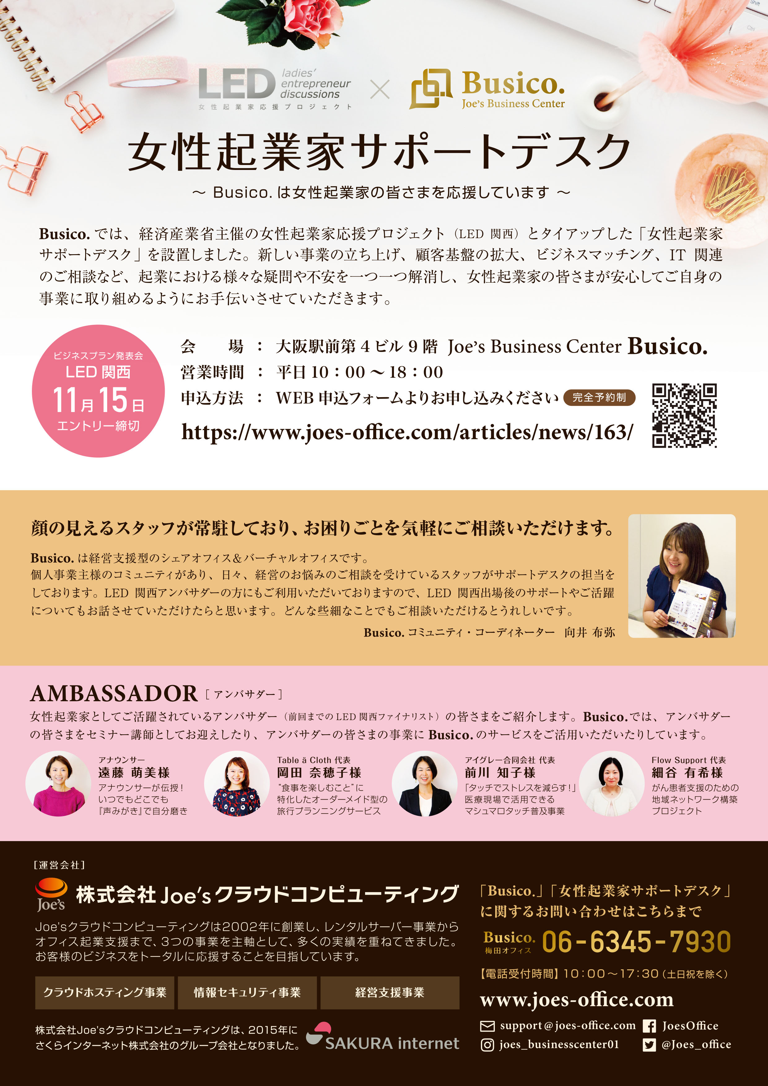 2018年9月25日より女性起業家応援プロジェクトLED関西(レッド関西)とタイアップした「女性起業家サポートデスク」を設置しています!
